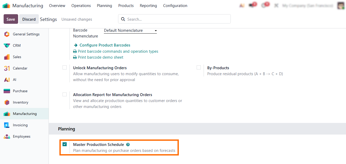 start, open the “Manufacturing” module settings and enable the “Master Production