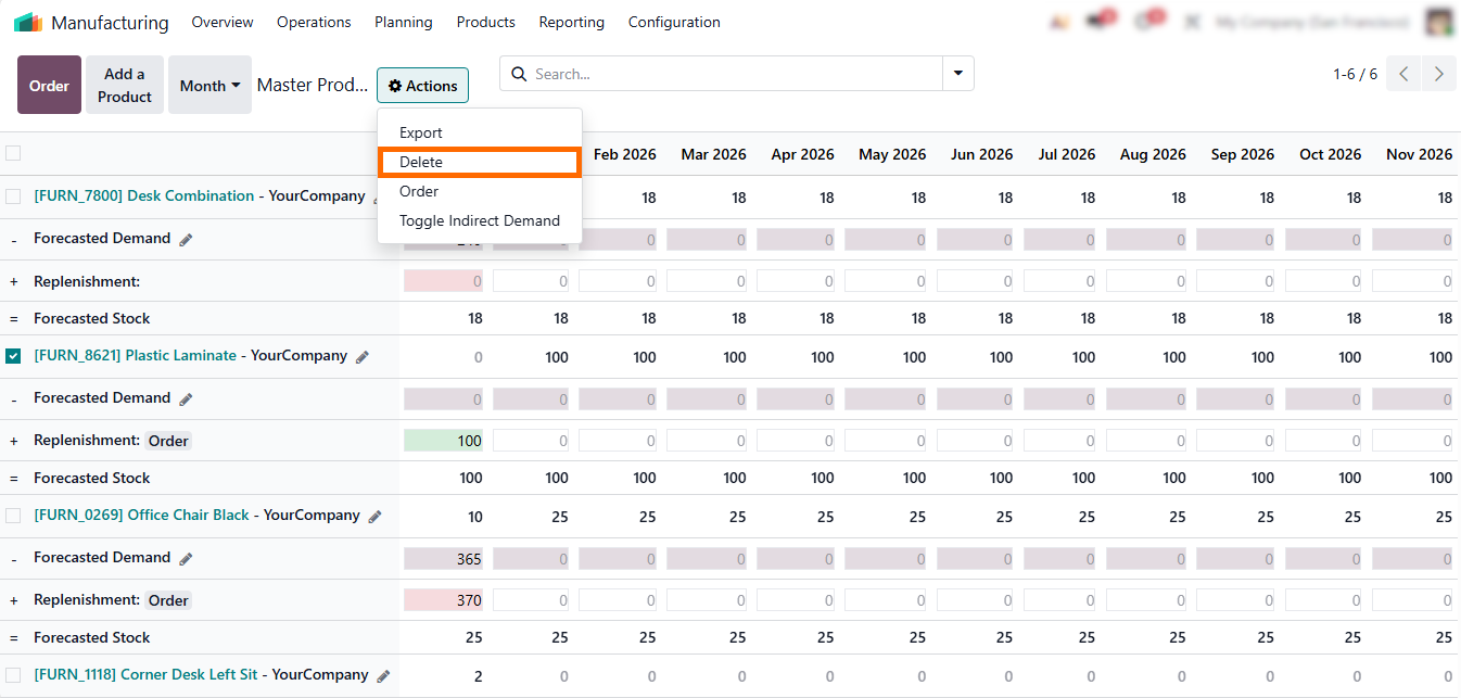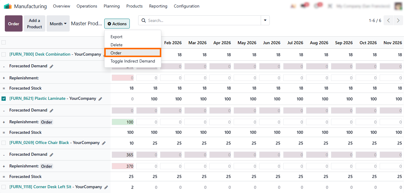 The Odoo master production schedule serves as both a planning hub and an operational command center, enabling precise MPS execution and informed master scheduling decisions. Built-in actions features allow planners to move instantly from analysis to execution – exporting data, triggering production or purchase orders, cleaning outdated plans, and controlling indirect demand visibility. These actions support the full master production schedule process, helping teams manage MPS manufacturing, align MPS and MRP, and keep the master schedule production accurate without relying on external tools or manual spreadsheets. For companies using software MPS inside ERP, these are a key part of daily MPS planning and operations management.